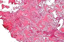 L'aspect habituel présente un stroma fibrovasculaire avec de nombreux ostéoblastes, du tissu ostéoïde, de l'os tissé bien formé et des cellules géantes. Les ostéoblastes étaient généralement petits et de forme régulière[2].
