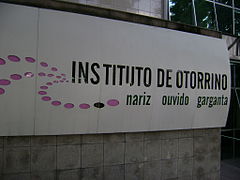 Un institut d'otorhinolaryngologie à Belo Horizonte, Brésil. On lit dessous : nez, oreille et gorge (nariz ouvido garganta).