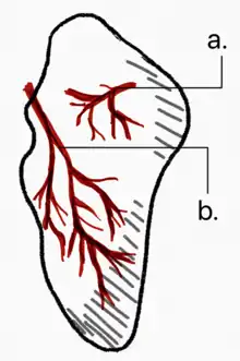 Représentation de l'os scaphoïde, vascularisé par 2 pédicules (a et b)