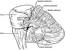 Les pédoncules cérébelleux relient le cervelet au tronc cérébral[1]. Il y a six pédoncules cérébelleux en total, trois à chaque côté :