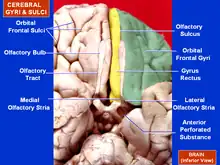 Le pédoncule olfactif et le bulbe olfactif se situent dans le sillon olfactif[3], un sillon formé par le gyrus orbitaire médial sur la face inférieure de chaque lobe frontal. Les pédoncules olfactifs se situent au niveau de ces sillons qui sont parallèles à la ligne médiane. Les fibres du pédoncules olfactif semblent se terminer sur tubercule olfactif (principalement dans la partie antéro-latérale), les parties dorsale et externe du noyau olfactif antérieur, les parties frontale et temporale de l'aire prépiriforme, le groupe cortico-médial des noyaux de l'amygdale et le noyau de la strie terminale[4].
