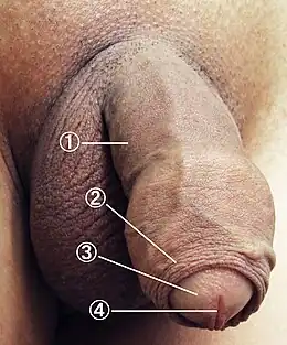 (1) corps de la verge (2) prépuce (3) gland (4) méat urinaire.