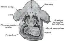L'ébauche embryologique du cœur est présente dès la fin de la 3e semaine de vie intra-utérine (au stade carnégie 9) à la suite de la fusion des deux tubes endocardiques, formant ainsi le tube cardiaque primitif. Cette ébauche se situe en avant de la plaque neurale, au sein du mésoblaste crânial. Le feuillet viscéral du péricarde provient du mésoblaste splanchopleural entourant le tube cardiaque primitif[embryo 1]. Tandis que l'épicarde dérive de la séreuse proépicardique[embryo 2]. Le péricarde va s'étendre et entourer les ébauches myocardiques et cardiaques. Notons que la zone de fusion postérieure de ces feuillets splanchnopleuraux s'appelle le mésocarde (bien que cette structure soit transitoire et finira par s'apoptoser)[embryo 3].