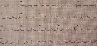 Ces anomalies sont diffuses dans toutes les dérivations et concordantes, sans image en miroir. Il existe rarement un aspect de bas voltage diffus lorsque l'épanchement est important. Il y a parfois des troubles du rythme auriculaire, fibrillation et flutter auriculaire[6].