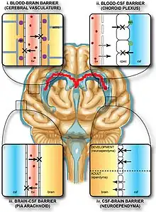 Selon une étude menée en Suède[13], les péricytes joueraient un rôle essentiel dans la régulation de l’étanchéité de la barrière hémato-encéphalique (BHE). Ils vont soit l’ouvrir et laisser passer des molécules de différentes tailles qui n’affectent pas le cerveau, soit la fermer pour empêcher le passage de toutes molécules pouvant induire des lésions au cerveau. De plus, les péricytes régulent le fonctionnement des astrocytes, qui soutiennent la BHE grâce à des extensions appelées podocytes. Ces extensions enveloppent les capillaires et règlent la circulation de l’eau et des ions.