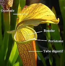 Chez les plantes carnivores, le péristome est un anneau réfléchi de tissu qui entoure l'entrée du tube digestif. Souvent (par exemple chez Cephalotus follicularis) le péristome présente des « dents », ce qui facilite la rétention des proies.