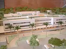Le bâtiment est intégré dans son environnement avec des "façades en béton clair agrémentées de panneaux menuisés et un patio intérieur"[2].