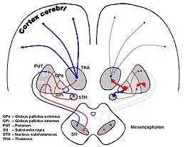 Le pallidum dorsal est un relais important des ganglions de la base impliqué dans de nombreuses fonctions cognitives et dans la motricité tandis que la partie ventrale, en connexion avec le striatum ventral participe au système limbique.