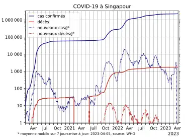 Le graphique montre le nombre total de cas confirmés en fonction du temps (par date) depuis le , date du premier cas signalé à Singapour. L'axe vertical suit une échelle logarithmique. Dans un tel graphique (connu sous le nom de graphique semi-logarithmique ), une croissance exponentielle du nombre de cas apparaîtra sous la forme d'une ligne droite sur le graphique. La pente de la droite détermine le taux de croissance du nombre de cas, avec une pente plus raide représentant un taux de croissance plus élevé.