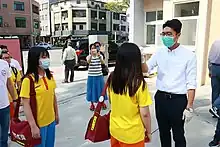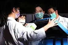Après une évaluation des stocks nationaux ainsi que la productivité de ses usines de fabrication, la présidente Tsai Ing-wen annonce ainsi un premier don d'un surplus de dix millions de masques, principalement vers les zones particulièrement touchées par l'épidémie, comme l'Espagne, l'Italie, le Royaume-Uni, la Suisse ou encore les États-Unis[105],[106]. La distribution nationale des masques fait par ailleurs l'objet d'une nouvelle régulation à partir du . Les adultes ont à présent accès à un nombre de neuf masques pour 14 jours sur présentation de leur carte d'assurance contre trois par semaine auparavant, tandis que les enfants conservent leur quota de dix masques pour 14 jours[107]. Cette mesure fait suite à l'obligation de porter un masque dans les transports en commun à compter du , sous peine d'une amende d'un montant entre 3 000 et 15 000 NT$ (environ 500 dollars), les usages de distanciation physique étant difficiles à mettre en place dans un bus ou une rame de métro ; les usagers de la ligne ferroviaire à grande vitesse ne portant pas de masque sont quant à eux redirigés vers le point de vente le plus proche[108].