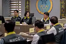 Le gouvernement taïwanais et les Centres de contrôle des maladies activent le Central Epidemic Command Center (CECC) le au niveau 3[Note 4], afin de coordonner la gestion de crise sanitaire à l'échelle nationale[2],[3],[4]. En tant que division du Centre de commandement national de la santé (NHCC) consacrée à la gestion des épidémies, lui-même créé en marge de l'épidémie de SRAS en tant que division de l'agence des CDC, le centre de commandement du CECC s'appuie sur l'expérience acquise lors des différents épisodes épidémiques ayant frappé le territoire taïwanais[2],[3],[4],[89]. Le CECC centralise les différentes actions[2] et tient une conférence de presse journalière pour faire un état des lieux sur le nombre de nouveaux cas et éventuels décès et guérisons, un point détaillé sur chacune des infections, une mise à jour des restrictions des flux humains et des nouvelles mesures entreprises[4],[21]. Elles contiennent également des rappels sur les règles de sécurité ainsi que sur les comportements-barrière qui sont particulièrement respectées ; le port du masque était par exemple déjà un réflexe culturel dans le cas d'une maladie[22]. L'activation du CECC permet également d'intégrer les ressources nationales administratives, académiques, et des secteurs privés afin de lutter contre cette nouvelle maladie[87].