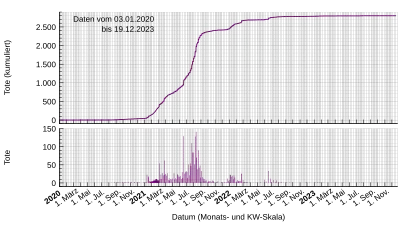 - En , il y avait 2 701 nouveaux cas et 20 décès, portant le nombre de cas à 325 470 dont 2 770 décès[20].