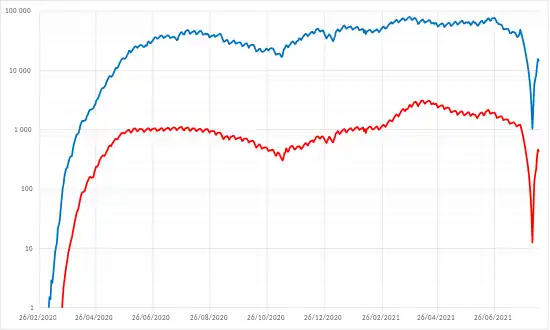 Le , le pays est le deuxième au monde en nombre de contamination et de décès juste derrière les États-Unis[2]. Le , le pays franchit la barre des 1 000 000 cas[3] puis le , le pays franchit le seuil des 50 000 décès[4].