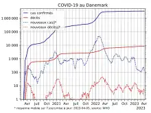 En février 2022, malgré la flambée des cas, alors que plus de 80 % de la population est vaccinée à 3 doses, le Danemark décide de traiter la maladie comme endémique, lève toutes les restrictions et annonce cesser toute vaccination au printemps[11]. Au début de mars le nombre de décès augmente en flèche alors que le nombre des cas décroit[12].