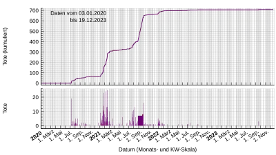 - En décembre il y avait 1 097 nouveaux cas et sept décès, portant le nombre de cas à 3 206 dont 51 décès[12].