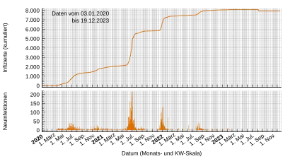 La barre des 10 cas est atteinte le 4 avril, celle des 100 cas est dépassée le 21 avril et celle des 1 000 cas le 12 juillet 2020.