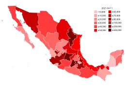 Au , il y avait 3 645 décès avec un lien confirmé avec la Covid-19, 35 022 cas confirmés cumulés dont 8 457 cas actifs, 19 979 cas suspects, et 130 956 personnes avaient été étudiées[126]. Ce à quoi on peut rajouter 247 décès dont un lien avec le SARS-CoV-2 est suspecté mais pas confirmé[126]. Les zones les plus touchées étaient par ordre décroissant : la ville de Mexico puis les États de Mexico, Tabasco, Veracruz, Basse-Californie, Morelos et du Yucatan[126].