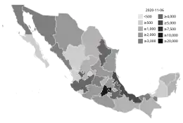 Le , il y a 30 366 décès avec un lien avéré et 252 165 cas confirmé de covid-19[177]. Ceci fait qu'en nombre absolu de morts (mais pas en proportion de la population) le Mexique devient le cinquième pays le plus touché au monde, surpassant la France, et le troisième pays le plus touché d'Amérique après les États-Unis et le Brésil[177].