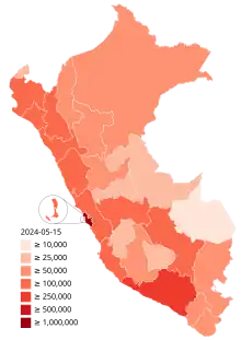 Le premier cas est confirmé par les autorités le : il s'agit d'un homme de 25 ans ayant séjourné en Espagne, en France et en Tchéquie[4]. Le , l'état de siège et la fermeture des frontières sont déclarés à cause de la pandémie, ce qui bloque au Pérou toutes les personnes qui s'y trouvent, y compris les étrangers souhaitant retourner dans leurs pays[5]. Le , la ministre de la Santé Elizabeth Hinostroza démissionne[6]. Le , démission surprise du ministre de l'intérieur Carlos Moran, probablement à cause du fort nombre de policiers infectés (1300 sur un total de 140 000)[6]. À cette date, il y avait 21 648 cas confirmés de covid-19 et 634 décès qui y étaient liés au Pérou[6].