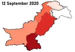 Fin mars 2020, le Pendjab est la région avec le plus grand nombre de cas qui s'élève à plus de 2 200 cas confirmés[50]. Plusieurs régions du pays ont imposé des fermetures jusqu'à la mi-fin avril pour endiguer l'épidémie[51]. Il s'agit notamment du Pendjab[52], du Sind[53], du Baloutchistan[54], de l'Azad Cachemire[55] et du Gilgit-Baltistan[56].