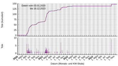 Le premier décès est annoncé le 14 mai 2020, le 10ème mort le 27 mai 2020, et le 100ème mort le 4 mars 2021[4],[5].