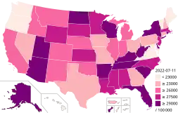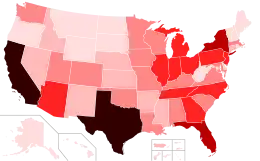 Le , le nombre de décès atteint le chiffre de 116 850 (origine : CDC), soit plus que de décès des États-Unis lors de la Première Guerre mondiale (116 500 environ)[57]. La Covid-19 a eu un impact négatif sur les contrats d'affaires[58]. Les États-Unis engagent officiellement leur procédure de retrait de l’Organisation mondiale de la santé en juillet (alors même que l'épidémie semble connaitre un important rebond dans le pays, la plupart du temps dans des États républicains)[59]. Cette décision est déplorée par la Fédération des scientifiques américains, pour qui ce retrait « ne fera que nuire à la lutte mondiale contre le Covid-19 »[60]. L’évolution de la situation dans les hôpitaux se dégrade. Selon The Washington Post, la remontée et synthèse de cette information étaient faites par les CDC et publiquement disponible sur internet, mais le ces données disparaissent du site internet des CDC, l'administration Trump ayant décidé de désormais confier ce travail à des organismes privés, suscitant une vive polémique dans le pays[61].