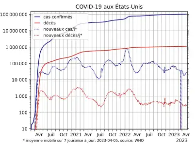 Le , 164 cas positifs dont 11 morts (ce décompte ne concerne pas les cas importés lors des rapatriements de citoyens américains) sont remontés aux Centres pour le contrôle et la prévention des maladies (CDC)[27]. Au , le nombre de personnes infectées passe à 1 010 cas dont 30 décès[28]. Environ une semaine plus tard, il passe à 13 816 cas testés positifs et 207 morts[29].