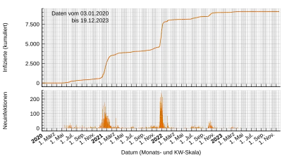 En août il y avait 37 cas confirmés, portant le nombre total à 423 dont sept décès[23].