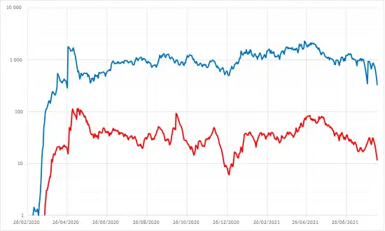En date du , les autorités ont recensé environ 116 000 cas, ainsi que plus de 10 000 décès, dont 6 648 décès confirmés et 3 751 décès probables[4],[5]. Une estimation du Financial Times montrerait que ce total sous-estime fortement le vrai bilan, qui serait de 19 200 morts excédentaires entre janvier et mi-mai, dont 12 000 dans la seule province du Guayas[6].
