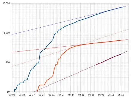 Le , 129 nouveaux cas confirmés et quatre nouveaux décès sont recensés en 24 heures, portant le nombre total de cas confirmés à 3 256 et celui des décès à 419[81].