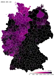 Le , l'Allemagne dénombre officiellement 8 604 cas ainsi que 30 décès et plus de 46 personnes rétablies. Le , l'Allemagne compte 685 721 cas et 11 385 décès[8], avec un taux de contagion qui repart à la hausse[9]. Au , le pays compte 24 000 morts[6].
