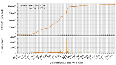 Décembre 2022 : 641 nouveaux cas et huit décès, portant le nombre de cas à 105 095 dont 1 930 décès[36].