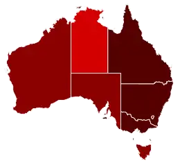 Le , les autorités australiennes signalent 8 001 cas de contamination et 104 morts[15]. Le à minuit, la frontière entre le Victoria et la Nouvelle-Galles du Sud, les deux États les plus peuplés d’Australie, ferme pour une durée indéterminée. Une première depuis 1919 quand il eut la pandémie de grippe espagnole[réf. nécessaire].