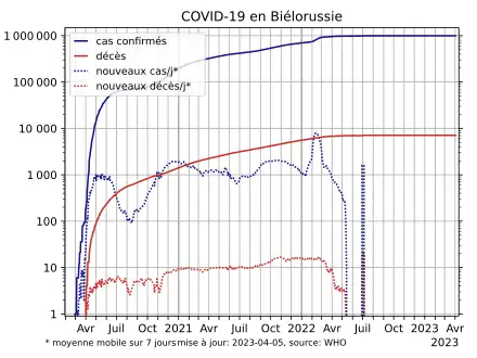 - ↑ LE TABLEAU SYNOPTIQUE DU NOMBRE DE CAS, DE MORTS, GUÉRISONS ET TENDANCES EN BIÉLORUSSIE
