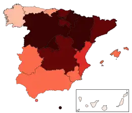 - Au , il y a 643 cas confirmés de Covid-19, 17 morts et 30 guérisons. La maladie progresse rapidement en 24 heures, le le royaume d'Espagne compte 909 cas, 25 morts et 32 guérisons[23]. Au Pays basque, le nombre des personnes atteintes est passé de 102 à 149 le en 24 heures. Cette région est la plus touchée après celle de Madrid où ce chiffre a plus que doublé en 24 heures, passant de 202 à 469[24].