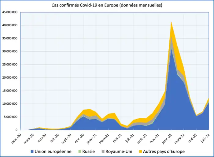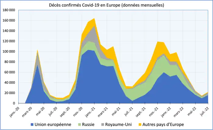 Le graphique ci-dessous montre le nombre de décès mensuels confirmés dus à la Covid-19 en Europe par groupe de pays (Union européenne, Russie, Royaume-Uni, autres pays d'Europe) depuis le début de la pandémie[S 5].