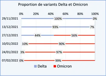 Toutefois le nouveau variant Omicron du SARS-CoV-2, détecté en pour la première fois, se diffuse rapidement d'abord au Royaume-Uni puis partout en Europe[12],[13]. Selon l'ECDC et l'OMS, le variant Omicron présente un risque très élevé que la vaccination seule ne permettra pas d'enrayer, en raison des déficits toujours existants, et exige donc un renforcement des restrictions sanitaires[14]. Au , le variant Omicron représente en Europe en moyenne sur les deux semaines précédentes 90 % des contaminations par le SARS-CoV-2. Sa grande contagiosité provoque une explosion du nombre de cas. Au , la proportion du variant Omicron monte à près de 100 %.