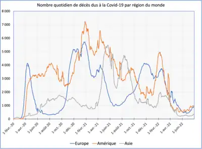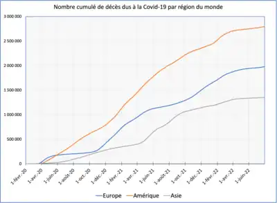 De à , l'Europe a été touchée par plusieurs vagues successives d'épidémie de Covid-19. Selon les données publiées par l'université Johns-Hopkins, la pandémie a causé au au moins 6,4 millions de décès dans le monde, dont 2 millions en Europe, soit 31 % du total mondial. Les États-Unis avec plus d'un million de décès, le Brésil avec 680 000 décès et l'Inde avec 530 000 décès officiellement confirmés concentrent à eux trois plus d'une victime sur trois de la Covid-19 dans le monde. Rapporté à la population de chacune des trois grandes régions du monde figurant sur le graphique ci-contre, l'Amérique est la plus touchée avec 276 morts pour 100 000 habitants, suivie de l'Europe (250 morts) et de l'Asie (30 morts)[S 1],[S 2],[S 3],[S 4].