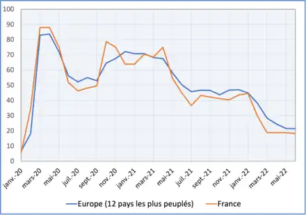 Le graphique ci-contre montre la valeur atteinte par cet indice pour les douze pays d'Europe les plus peuplés et pour la France à la fin de chaque mois depuis le début de la pandémie en janvier 2020. Les restrictions sanitaires les plus drastiques sont mises en place durant la première vague lorsque les États ne disposaient que de peu de moyens thérapeutiques pour lutter contre la pandémie. Durant les vagues de l'hiver 2020-2021 et du printemps 2021, les restrictions sont importantes mais moins drastiques en raison de l'expérience accumulée durant la première vague, de la volonté de ne pas stopper à nouveau l'économie et du déploiement accéléré de la campagne de vaccination dans la plupart des pays d'Europe. Durant les vagues suivantes de la seconde moitié de 2021, le niveau de vaccination de la population est devenu suffisant pour limiter encore davantage les mesures de restriction sanitaire. Celles-ci sont à nouveau réduites lorsqu'il est avéré que les nouveaux variants Omicron, très contagieux et à l'origine d'une flambée de cas, sont d'une dangerosité moindre. Les politiques sont assez voisines d'un pays à l'autre. Toutefois des différences marquées sont observées durant la cinquième vague, le Royaume-Uni maintenant une politique de restrictions sanitaires limitées, tandis que la France et l'Allemagne conservent des protocoles plus stricts incluant notamment l'usage du passe sanitaire et le port du masque[18],[20].