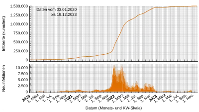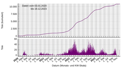 Le 15 avril 2020, un petit pic de contamination se note avec 117 nouveaux cas et 10 nouveaux décès. Tout le reste de l'année la maladie ne se propage guère et fait peu de décès, en novembre elle augmente un peu pour redescendre avec peu de cas et presque aucun décès à l'été 2021. À l'automne elle reprend pour faire un pic au début de 2022, redescendre puis atteindre le 13 mars 2022 10 795 nouveaux cas et une trentaine de décès.