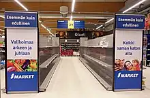 Comme dans d'autres pays, l'émergence du virus a augmenté les ventes et le stockage de produits quotidiens, tels que l'épicerie et les produits d'hygiène. Les craintes de quarantaine et les pénuries potentielles ont conduit à des achats de panique, en particulier de produits en conserve, de désinfectant pour les mains et de papier hygiénique[39]. Le , la Central Finnish Cooperative Society (filiale du groupe S) a signalé un nombre estimé à deux à trois fois plus de visiteurs que d'habitude[40]. Kesko a également signalé des augmentations similaires. La pratique de l'auto-isolement a également accru la demande d'épiciers en ligne.