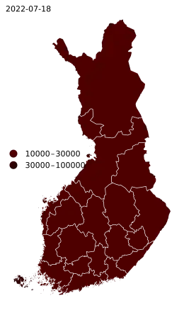 THL considère le chiffre donné par le registre finlandais des maladies infectieuses comme le chiffre officiel et, le , 304 des cas confirmés avaient été signalés au registre[33],[28]. Le lendemain, environ 450 cas avaient été confirmés dans le pays. Le plus grand nombre de cas a été identifié dans le district hospitalier d'Helsinki et d'Uusimaa, dans le sud de la Finlande.