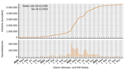 Le premier cas en Grèce est enregistré le 26 février 2020, le premier décès le 12 mars 2020. La barre des 10 cas est dépassée le 5 mars 2020 ; celle des 100 cas le 12 mars ; celle des 1 000 cas le 28 mars ; celle des 10 000 cas le 30 août ; celle des 100 000 cas le 27 novembre 2020 ; et celle des 1 000 000 cas le 5 décembre 2021.