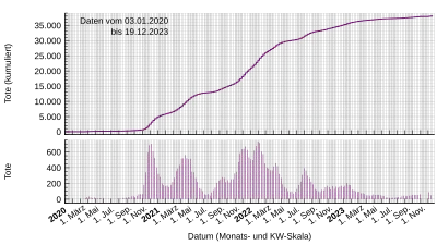 La barre des 10 morts est atteinte le 20 mars 2020 ; celle des 100 morts le 14 avril ; celle des 1 000 morts le 14 novembre ; et celle des 10 000 morts le 25 avril 2021.