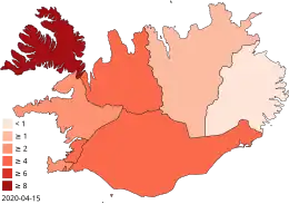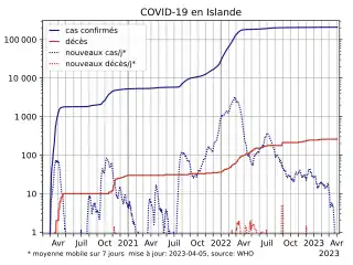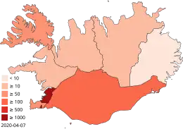 Le , le nombre total de cas enregistrés est de 1 785, dont 1 462 se sont rétablis et 10 sont décédés. Avec une population totale de 364 260 habitants (au ), le taux d'infection est d'un cas pour 245 habitants, l'un des plus élevés au monde. Toutefois, le pays est également celui où le nombre de tests effectués par habitant est le plus élevé au monde[3]. Il s'agit notamment d'un dépistage de la population générale dirigé par la société islandaise deCODE genetics pour déterminer la véritable propagation du virus dans la population[4]. Au , le taux de létalité lié au Covid-19 en Islande était le deuxième plus bas au monde, à 0,29 %[5].