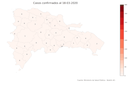 Le , le premier cas du pays et des Caraïbes est confirmé. Il s'agit d'un homme de 62 ans en provenance d'Italie, qui est transféré dans un hôpital de Bayahibe[2]. Le , le deuxième cas est confirmé : un touriste canadien[3]. Trois nouveaux cas sont confirmés le , ce sont des Dominicains revenus d'un voyage d'Italie[4]. Le , le ministre de la santé, Rafael Sánchez Cárdenas, confirme six nouveaux cas. Tous ces individus sont revenus depuis l'extérieur du pays dans les quatorze jours précédents[5].