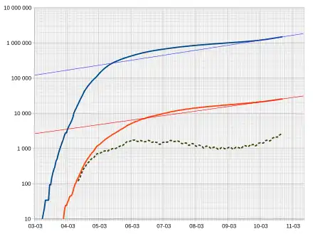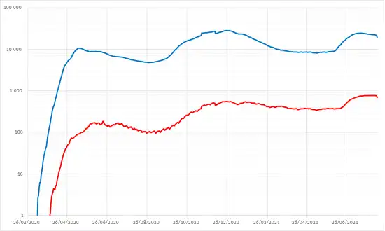 - Le 1er juillet, 6 556 nouveaux cas sont confirmés, portant le total à 654 405[24]. La progression de l'épidémie se maintient jusqu'à atteindre 839 941 cas confirmés le [25].