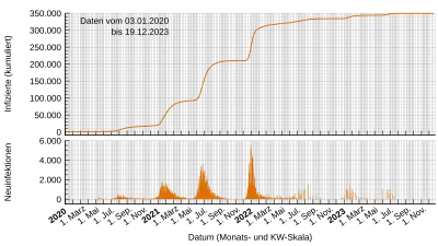 La barre des 10 cas a été atteinte le 25 mars 2020 ; celle des 100 cas le 29 avril ; celle des 1 000 cas le 27 mai ; celle des 10 000 cas le 18 août 2020 ; et celle des 100 000 cas le 6 juin 2021.