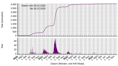 Le premier décès est intervenu le 2 avril 2020 ; le 10ème le 8 juin ; le 100ème le 17 juillet ; et le 1 000ème le 19 février 2021.