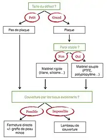 Dans le cas des ostéoradionécroses, la stabilisation pariétale n'est souvent pas nécessaire en raison de la raideur fibreuse des tissus environnants[15],[12]. La priorité est à l'apport de tissu bien vascularisé, par un lambeau, afin de permettre la cicatrisation[15],[18].